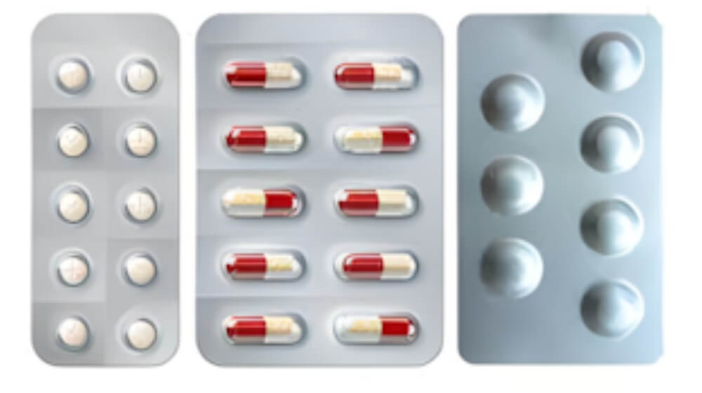The formed plastic blister (made of PVC/PET/PVDE or Alu, etc.) is firmly sealed with aluminum foil or heat-sealing film to form a sealed packaging cavity, protecting the medicine from moisture, oxygen and contamination.